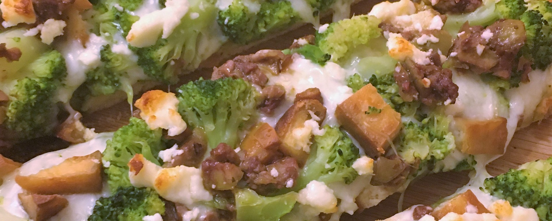 The trick to making sorta healthy pizza is a lot of veggies and zero fatty meat. I always make mine vegetarian but you can add chicken breast, shrimp or some other very lean meat. Keep your veggies sliced extra thin to prevent them from getting watery. For the pizza in the picture, I used frozen broccoli that I par-boiled for a couple of minutes then placed on my cutting board and cut in small pieces. I also happened to have smoked tofu that needed to get used (yes, I’m a tofu weirdo) which ended up tasting like bacon. The crust is store bought. Substitute any of my ingredients and use what you like!